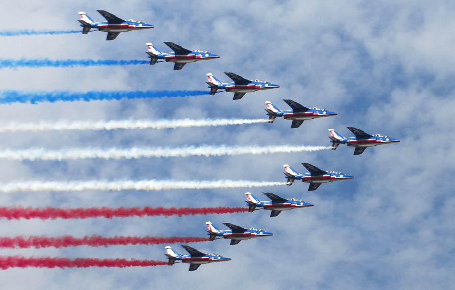 9月19日,智利首都圣地亚哥举行了盛大阅兵式庆祝独立199周年。图为法国特技飞行表演队“法兰西巡逻兵”在阅兵仪式上进行表演。