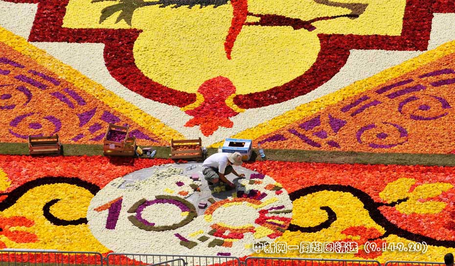 9月16日,在以色列特拉维夫的拉宾广场,由100多名志愿者用50万朵鲜花铺成了一张巨型地毯,用以纪念特拉维夫建城100周年。图片来源:中国新闻网