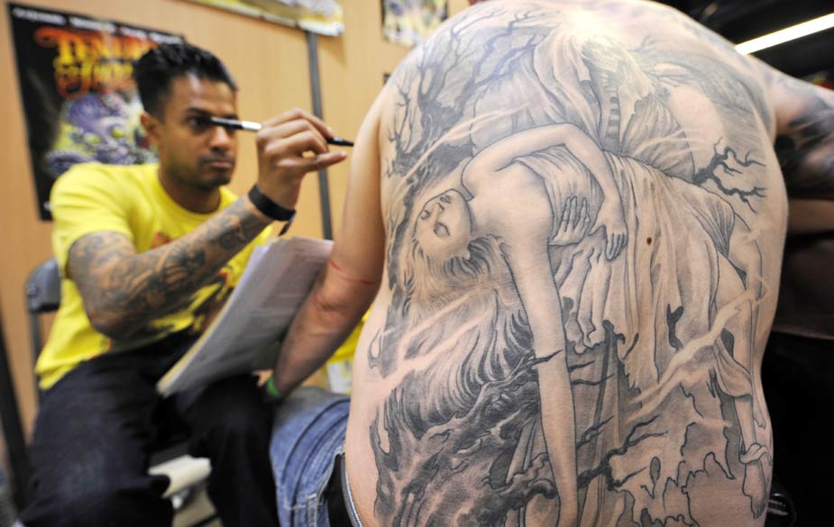 法国巴黎9月20日举行“纹身艺术节”,吸引了成百上千纹身艺术大师到场献艺。图片来源:中国新闻网