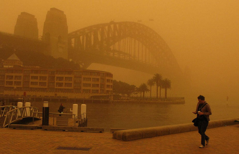 澳大利亚悉尼23日出现罕见的沙尘暴,加上风速每小时上百公里的强风吹袭,全城笼罩在一片橘红色的尘雾中,由于能见度相当低,飞机和渡轮暂时停飞或停驶。