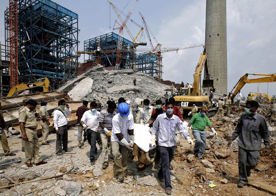 印度中部一座在建电厂的巨型烟囱23日下午发生倒塌,目前估计已有至少100人罹难。图片来源:中国新闻网