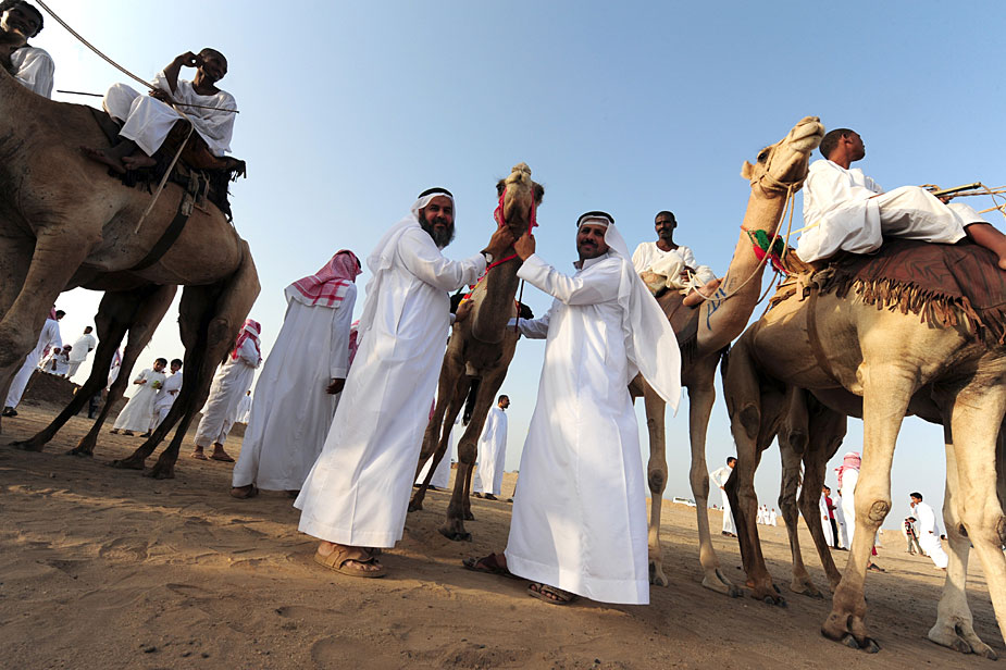9月25日,在沙特阿拉伯东部的哈利斯,骆驼骑士们骑着自己的座驾在大漠中飞驰。图片来源:中国新闻网