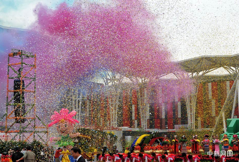 9月26日,第七届中国花卉博览会在北京顺义主场馆广场隆重开幕,现场彩带漫天飞舞“花雨”从天而降,以及异彩纷呈的表演成为一道丰盛的视觉大餐。中新网记者 金硕 摄