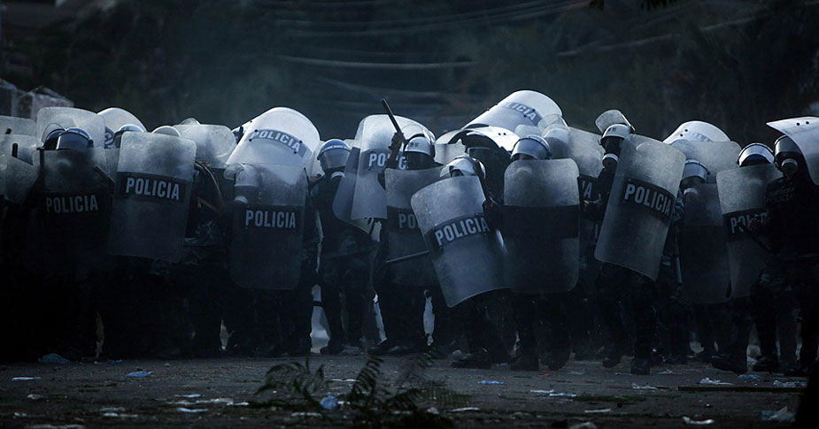 22日,在洪都拉斯首都特古西加尔巴的巴西大使馆外,防暴警察与被逐总统塞拉亚的支持者发生冲突。图片来源:中国新闻网
