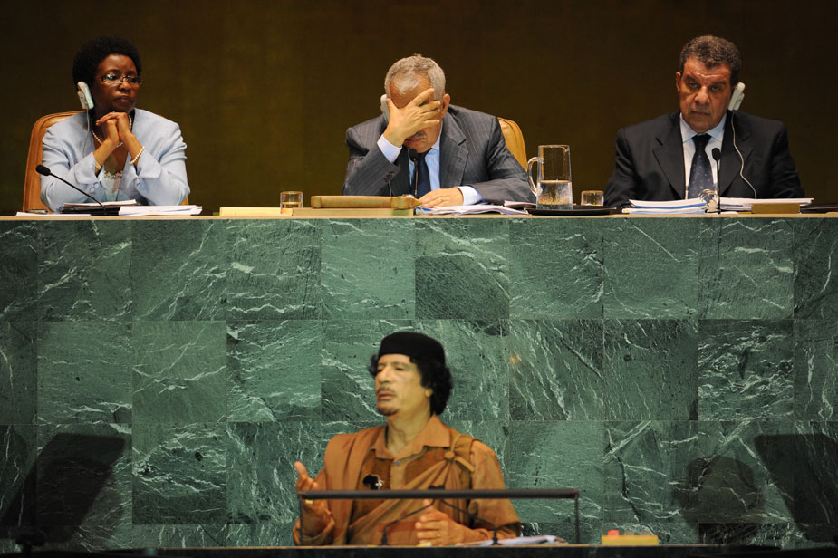 执政40年来首次在联合国亮相的利比亚领导人卡扎菲,23日在联大一般性辩论上发表演讲,强力攻击安理会和联合国的现有体制,并将原定15分钟的演讲拖到一个半小时,很多国家代表团成员最后坚持不住,纷纷离开会议现场。图片来源:中国新闻网