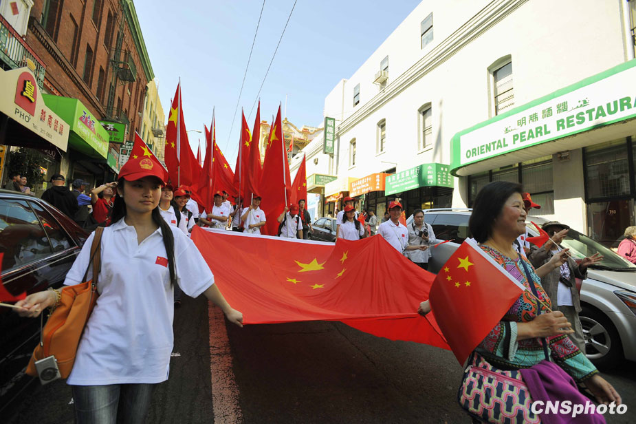 当地时间9月26日,美国旧金山数千华人华侨在旧金山中国城持巨幅国旗游行,庆新中国六十华诞。 图为中国留美学生、学者的游行队伍。中新社发 陈钢 摄