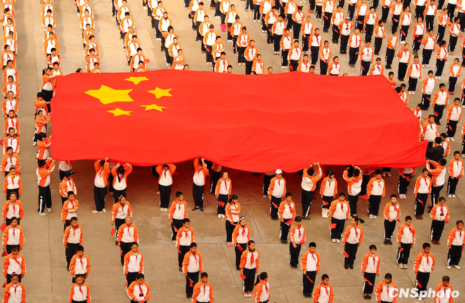 9月28日,黑河市第六小学举行“同升一面旗 共爱一个家”活动,迎接中华人民共和国成立六十周年。仪式上,黑河市第六小学学生传统师生亲自缝制的70平方米的五星红旗,并在国旗下朗诵《我爱你我的祖国》,共同祝福祖国的明天更美好。中新社发 邱齐龙 摄