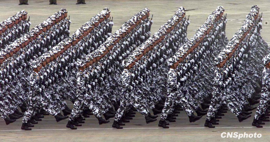 图为1999年国庆阅兵式上海军陆战队方队从天安门前走过。中新社发 李刚 摄