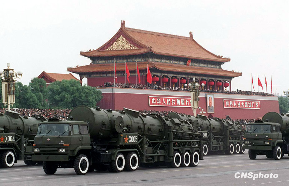 图为中国第二炮兵部队装备的远程地地核导弹出现在1999年国庆阅兵式上。 中新社发 钱兴强 摄