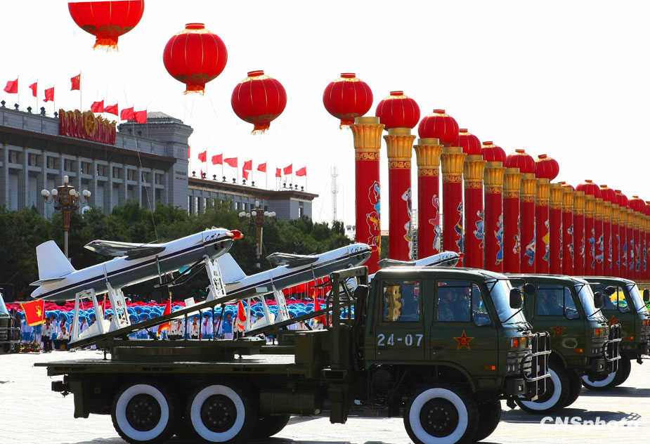 2009年10月1日,中华人民共和国成立60周年庆祝大会在北京天安门广场举行。图为无人机方队接受检阅。中新社发 宋吉河 摄