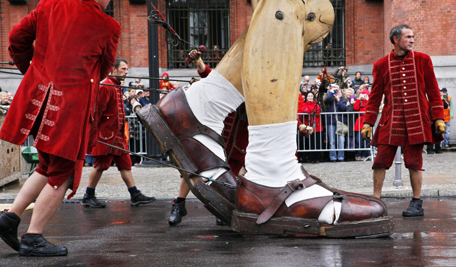 10月2日,来自法国一家戏剧公司的两个巨型提线木偶亮相柏林街头,它们将在露天剧场进行表演,以此纪念柏林墙推倒20周年。