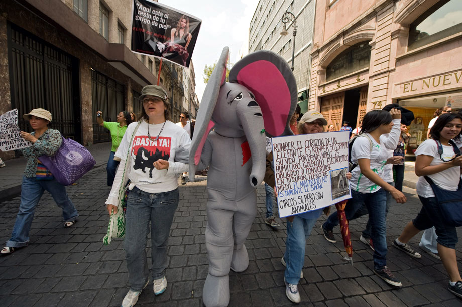 10月4日,在墨西哥首都墨西哥城,参加世界动物日活动的人们头带面具,手举图片,呼吁人们关注动物权益。