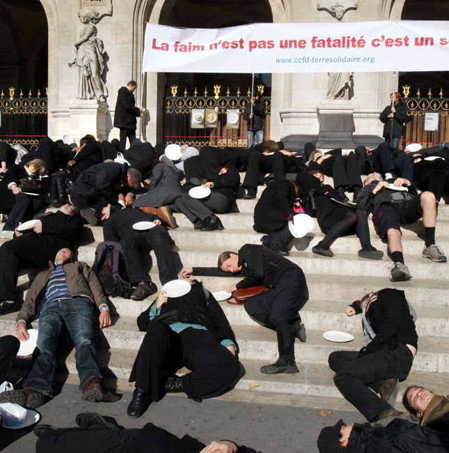 10月15日,示威者身穿黑色衣服、手持空盘子在巴黎歌剧院前抗议。他们此举是为了呼吁人们关注世界上的饥民。图片来源:中国新闻网