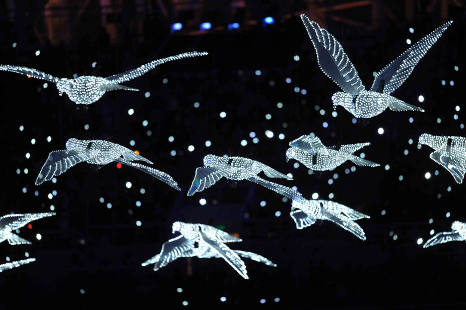 十月十六日晚,中华人民共和国第十一届运动会在山东济南奥体中心隆重开幕。开幕式晚会上和平鸽在体育场飞翔。中新社发 陈文 摄