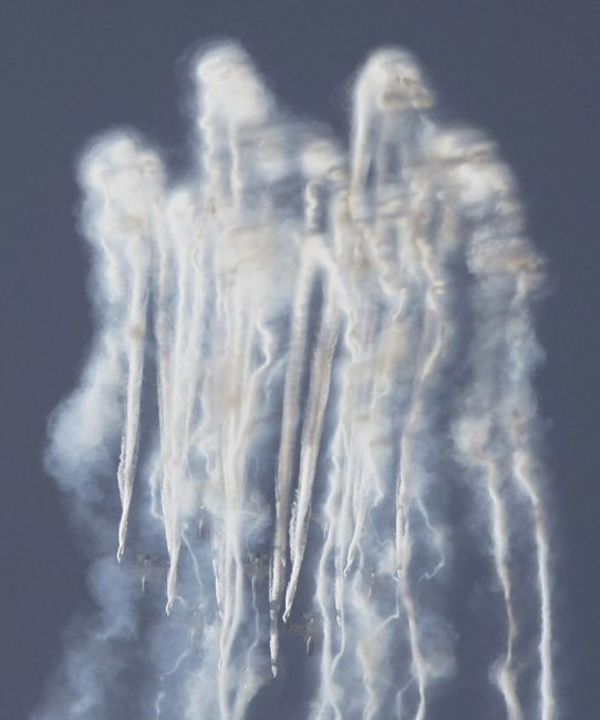 10月20日,韩国黑鹰特技飞行表演队在2009首尔国际航空航天与国防展上进行精彩的特技飞行表演。 图片来源:中国新闻网