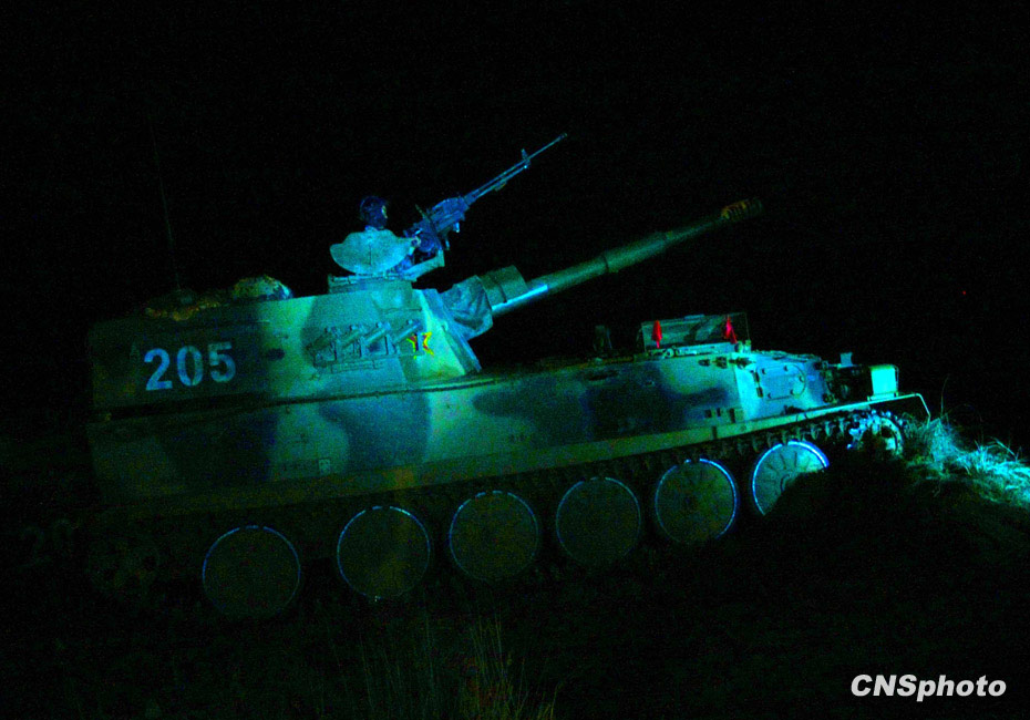 当晚国防大学防务学院、空军指挥学院的外军学员,以及英国、以色列、土耳其、巴基斯坦等国军事观察员亲临现场观摩了后勤保障战斗准备、自行榴弹炮占领阵地、装甲车辆“摸黑”开进等战斗要素。图为摸黑”开进的装甲战车进入战位。中新社发 宋吉河 摄