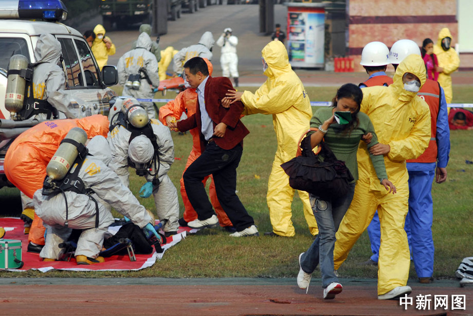紧随其后进场的是防化医学救援队。该分队指挥员带领后续侦察分队、洗消分队和化验组,分别乘坐4辆防化侦察车、1辆淋浴车和1辆防化化验车入场。穿蓝色和橙色防护服的防化医学救援队入场后,医疗卫生人员迅速展开装备,组织检验监测,开设临时医疗所,区分观察区、检诊区、洗消区和处置区,救护车开始中毒人员转运。 郝飞 摄