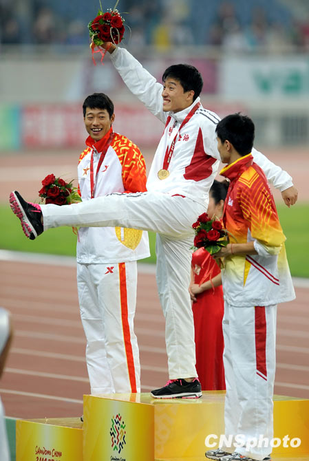 10月25日,在全运会田径男子110米栏决赛中,上海代表团选手、“中国飞人”刘翔以13秒34的成绩勇夺冠军,同时也成就了其全运会该项目三连冠的伟业。 中新社发 陈文 摄