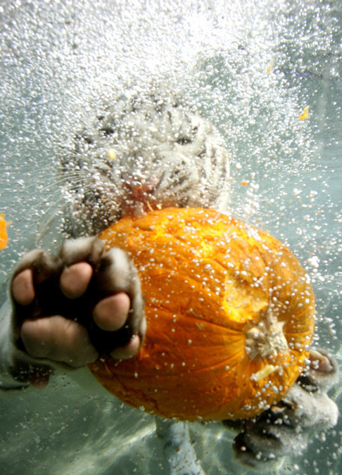 10月28日,美国加利福尼亚州Vallejo,六旗探索王国游乐园里的孟加拉虎在水下撕咬万圣节南瓜,还用虎掌挡镜头拒拍“耍大牌”。