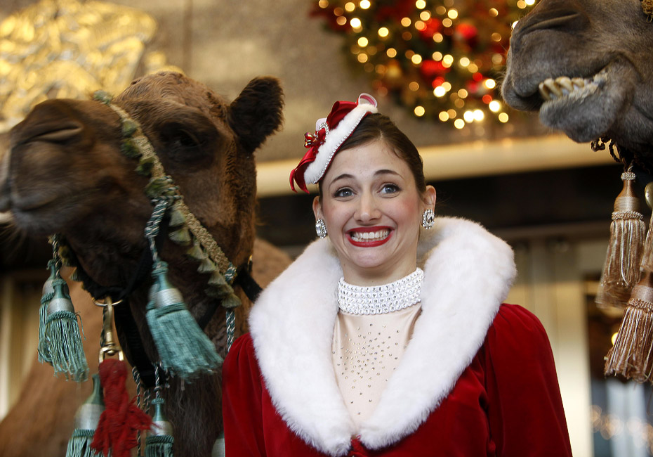 10月29日,火箭女郎舞蹈团的姑娘们在美国纽约广播城音乐厅与众多动物明星合影,准备在圣诞秀上亮相。图片来源:中国新闻网