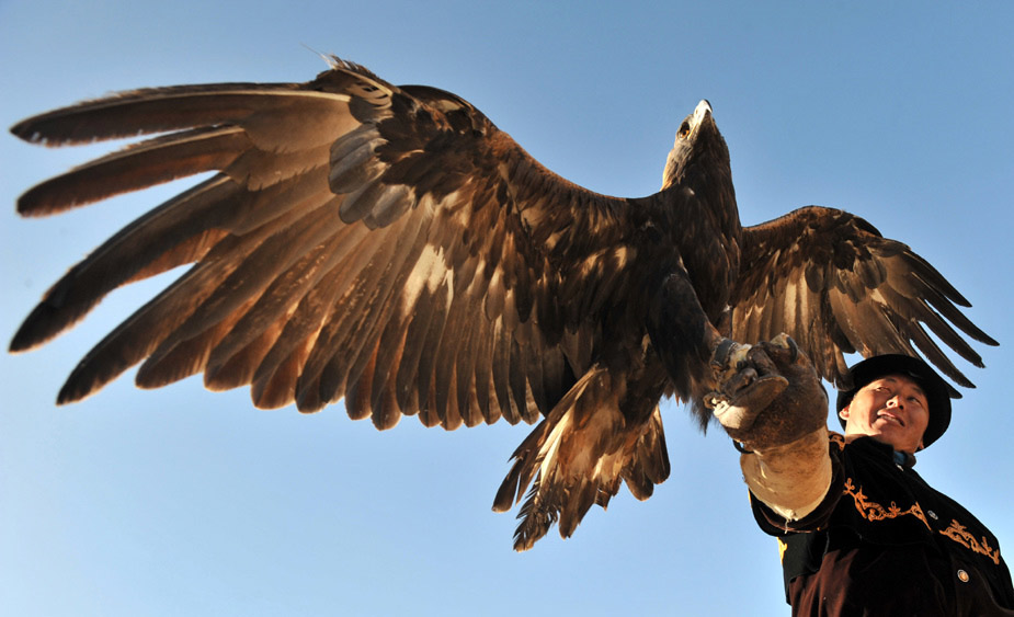 10月30日,在吉尔吉斯斯坦Bokonbayevo传统的狩猎节上,一只捕猎鸟在追猎物。图片来源:中国新闻网
