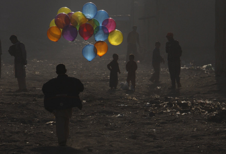 周日(25日),饱受战火的阿富汗,一个男孩在首都喀布尔街头手拿五彩气球。 来源:中国新闻网