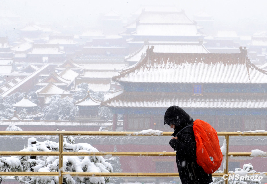 11月1日,深秋的北京大雪纷飞银装素裹,一名香港游客在北京景山上欣赏雪景。北京今年的初雪时间提前了整整一个月。中新社发 廖攀 摄