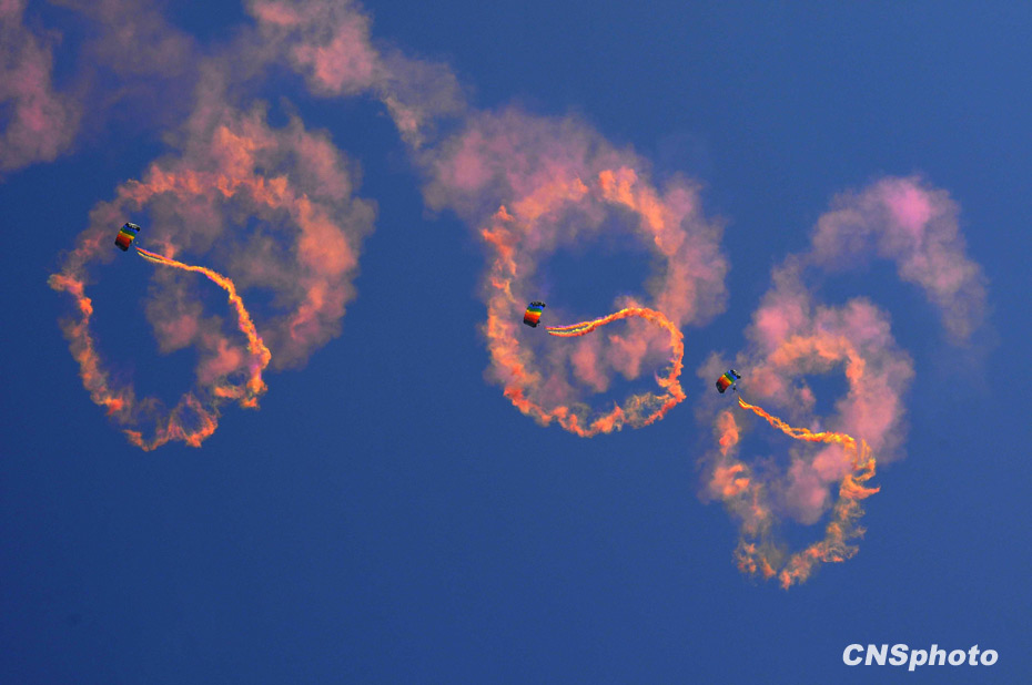 十一月三日,空军八一飞行表演队和空军八一跳伞队在北京沙河机场举行预演,迎接十一月十一日中国人民解放军空军建军六十周年。图为空军八一跳伞队表演。中新社发 潘旭临 摄