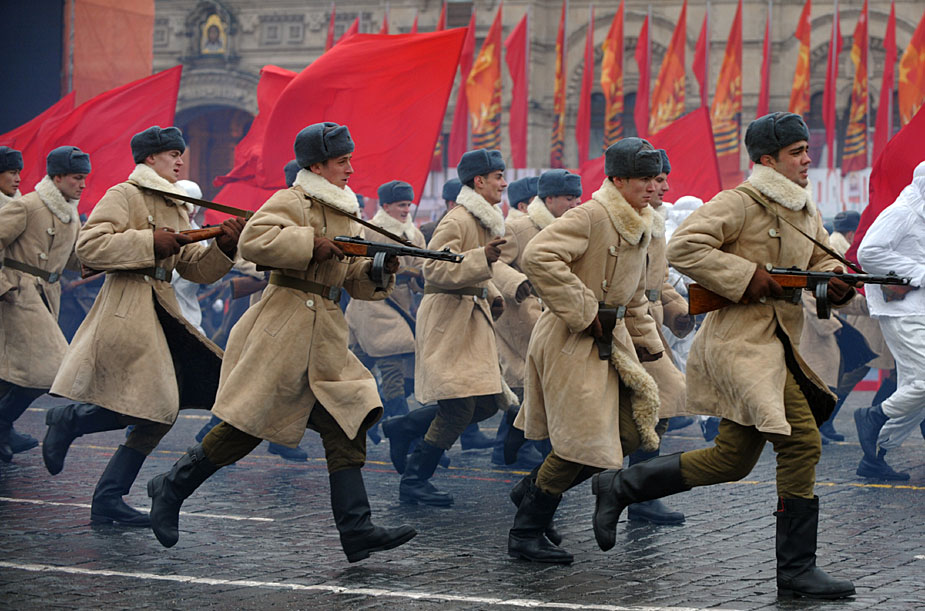 11月7日,俄罗斯士兵身穿二战时期的军服在莫斯科红场举行阅兵阅兵式纪念1941年红场阅兵。图片来源:中国新闻网