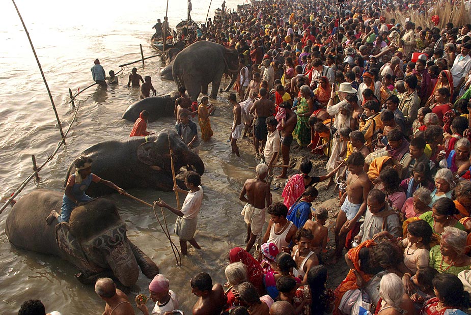 周一(2日),印度教信徒在印度卡尔蒂克为大象沐浴庆祝沐浴节。来源:中国新闻网