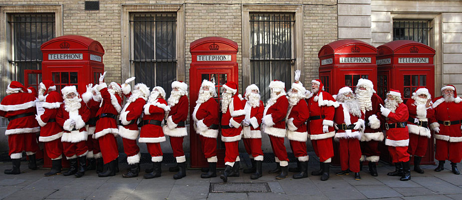 周三(4日),圣诞老人在英国伦敦排队打电话。来源:中国新闻网
