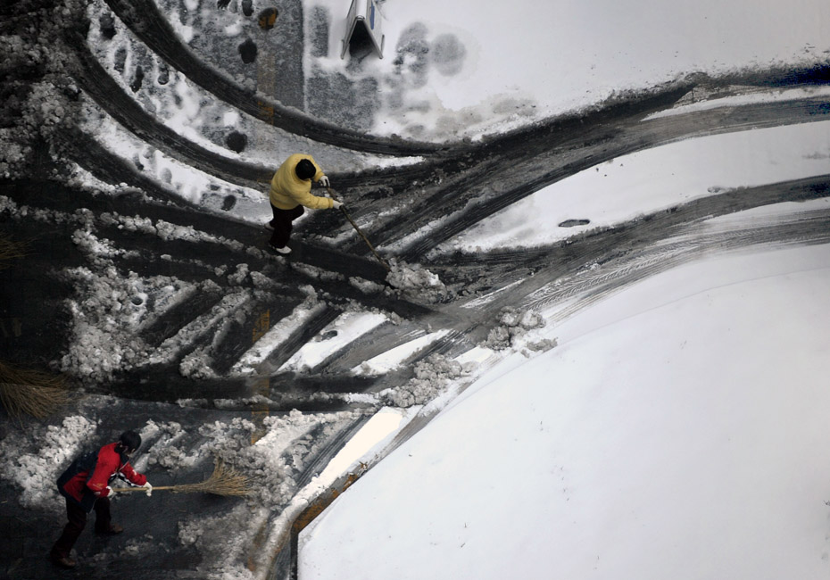 图为11月10日人们在北京一栋公寓楼下清除积雪。