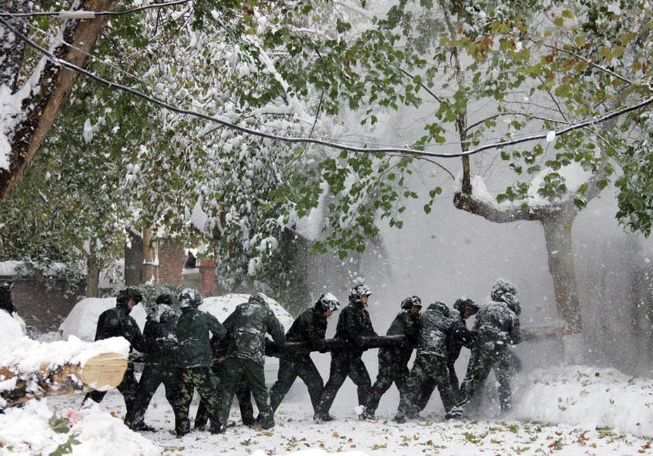11月11日,石家庄,部队官兵采用木棍撞击树上积压的雪。