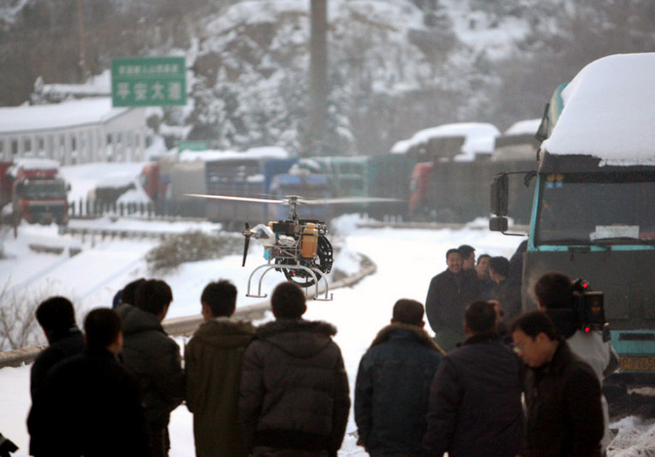 11月12日,受降雪影响,石太高速出现大堵车。图为央视正在航拍堵车情况。崔华瑞 摄