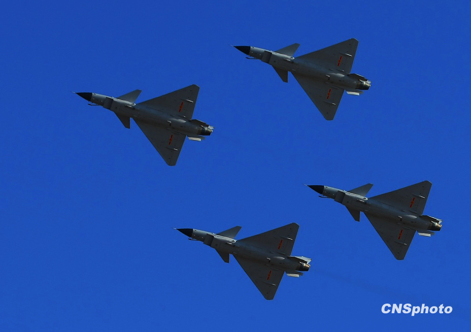 庆祝中国人民解放军空军成立60周年飞行表演,11月15日上午在北京沙河机场举行。表演按八一飞行表演队4架歼-10飞机表演12个动作和6架歼-7GB飞机表演15个动作,分四机对头交叉、四机菱形队大坡度盘旋、单机小速度平飞等27个动作,其中四机对头交叉动作是这次表演中技术难度较大的动作之一,这是国产三代飞机和国产二代飞机首次同场竞技表演。图为八一飞行队歼-10进行表演。中新社发 宋吉河 摄