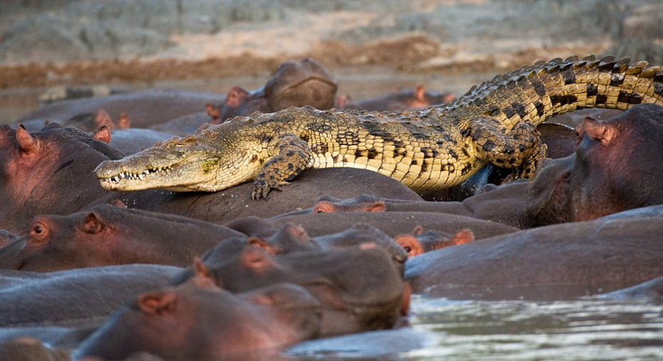 一条鳄鱼悄悄混入了正在河里洗澡的河马中,它很快就被敏感的母河马发现。愤怒的河马们立刻对它发起了猛烈地攻击,这条冒失的鳄鱼很快死于非命。