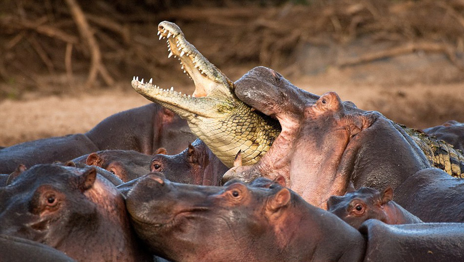 一条鳄鱼悄悄混入了正在河里洗澡的河马中,它很快就被敏感的母河马发现。愤怒的河马们立刻对它发起了猛烈地攻击,这条冒失的鳄鱼很快死于非命。