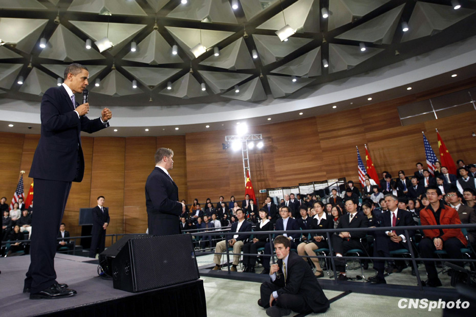 11月16日,正在中国进行国事访问的美国总统奥巴马,在上海就与中国青年交流,并现场回答提问。中新社发 盛佳鹏 摄