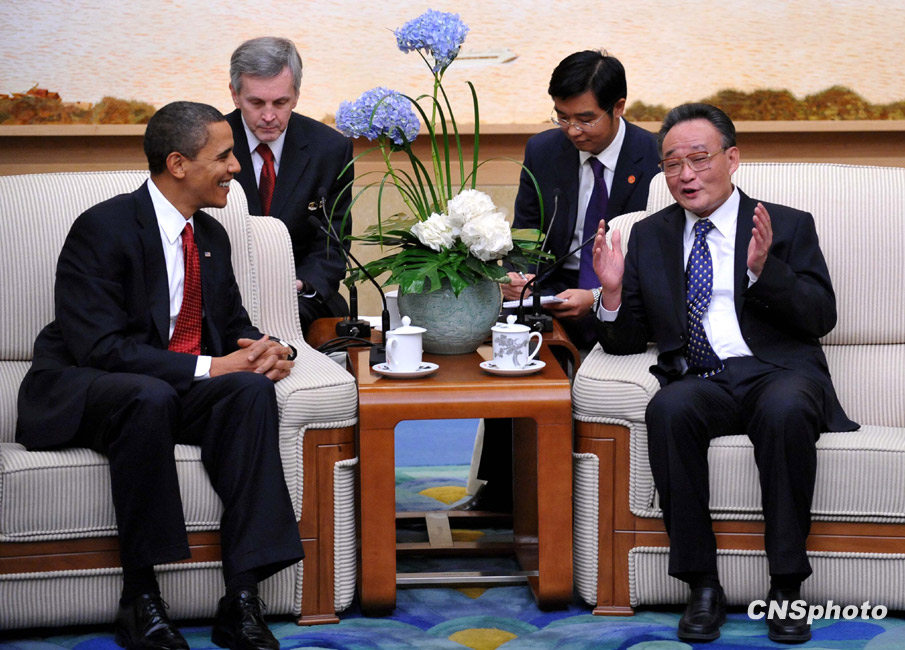 11月17日,中国全国人大常委会委员长吴邦国在北京人民大会堂会见了美国总统奥巴马一行。中新社发 廖攀 摄