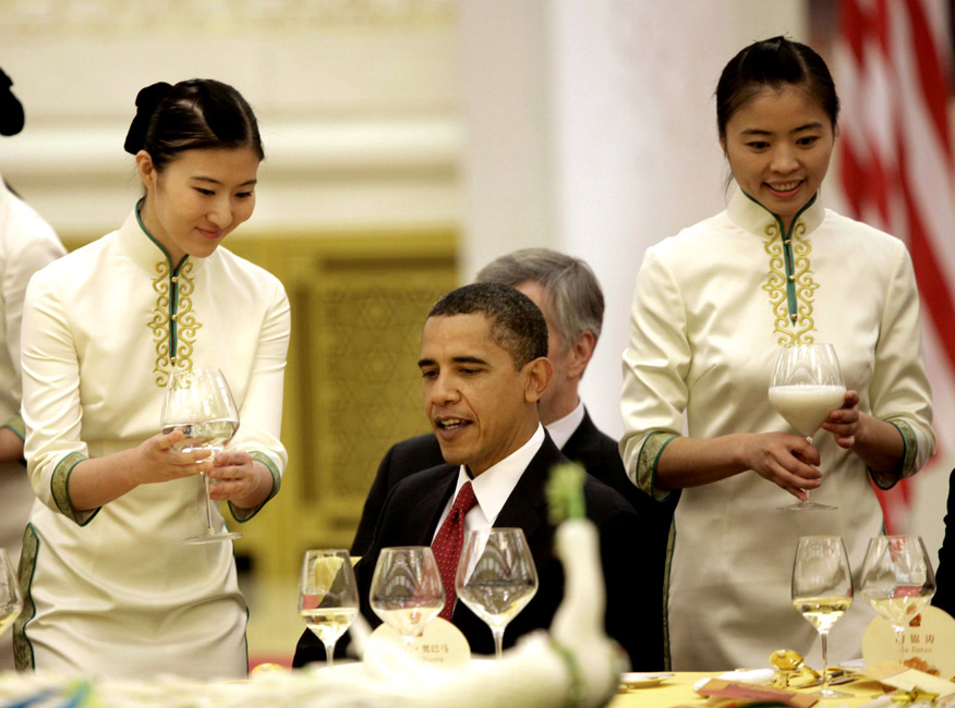 国家主席胡锦涛11月17日晚在北京人民大会举行盛大宴会,欢迎来华访问的美国总统奥巴马。