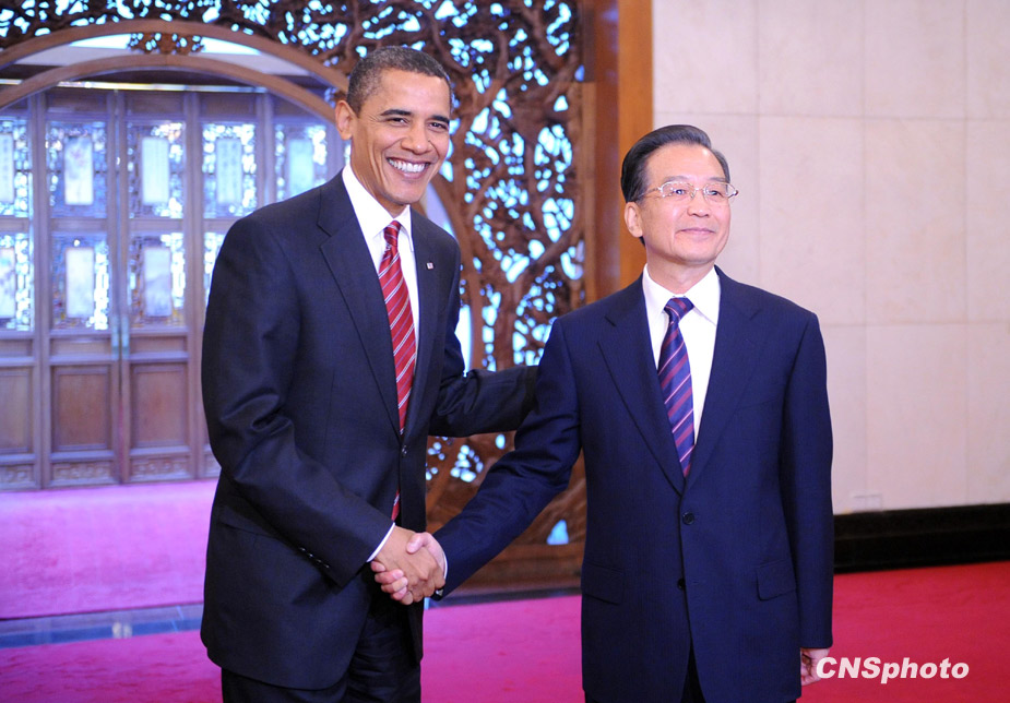 11月18日上午,中国国务院总理温家宝在北京钓鱼台国宾馆会见了美国总统奥巴马一行。中新社发 廖攀 摄