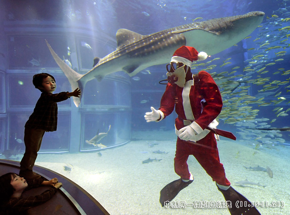 11月19日,一名装扮成圣诞老人的潜水员在日本大阪水旅馆的水族箱内欢迎游客光临。这是该水族馆为了迎接每年一度的圣诞节而搞的活动。图片来源:中国新闻网>>点击观看详细内容