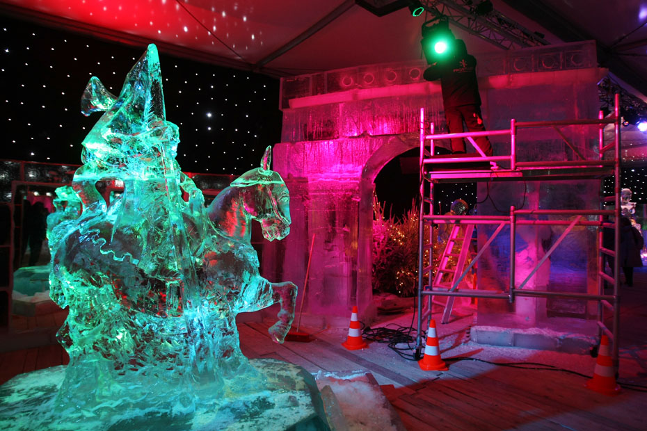 11月23日,为期一个月的“冰之魔术”艺术展在法国巴黎香榭丽舍开幕,16位艺术家利用440吨冰雕刻出精美的巴黎地标建筑和著名艺术家罗丹的“思想者”雕塑。图片来源:中国新闻网