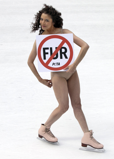 11月24日,美国花样滑冰的传奇人物、1979年世界花滑锦标赛冠军得主芭比洛尼在纽约洛克菲勒广场复出“裸滑”。这次表演是为了支持善待动物协会的反对皮草行动。