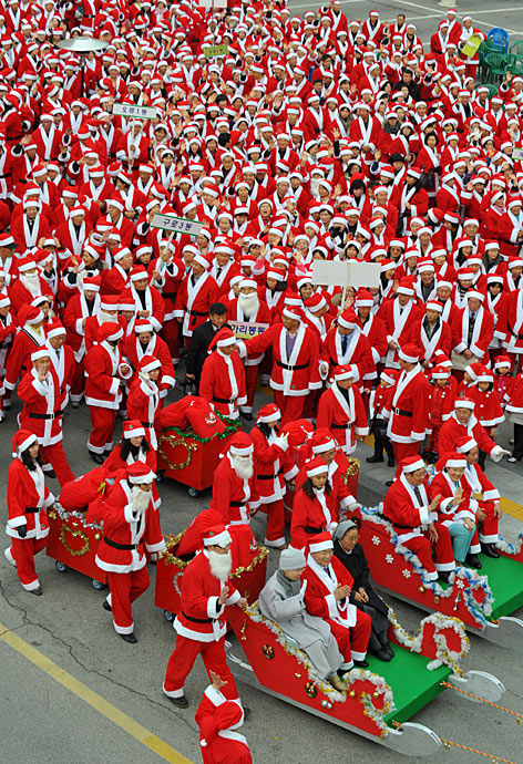 12月1日,韩国首都首尔市,一千多名“圣诞老人”举行游行为社会慈善项目筹款。图片来源:中国新闻网