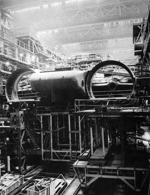 图为建造中的“台风”级巨大的涵道式螺旋桨推进器。图片来源:人民网