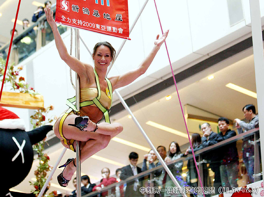 十二月三日,两项吉尼斯世界纪录钢管舞蹈家Nele Sehrt在香港APM商场三十呎高空献艺,示范一分钟抱钢管倒立动作。中新社发 洪少葵 摄 图片来源:中国新闻网>>点击观看详细内容