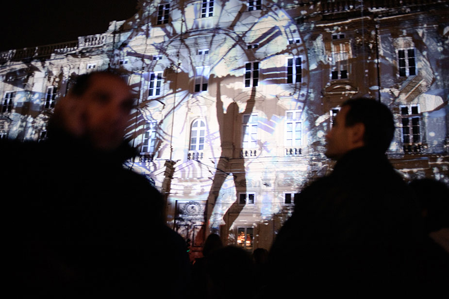 12月5日,在法国里昂,人们欣赏灯光表演。第11届灯节到来之际,里昂城被五彩变幻的灯光装饰。图片来源:中国新闻网