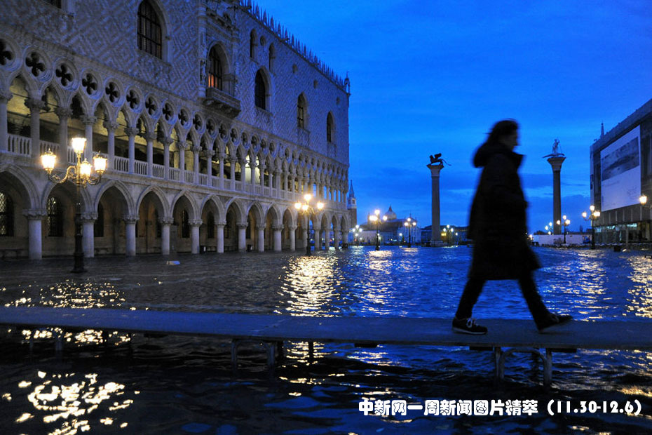 11月30日,意大利水城威尼斯受潮汐和一股强烈的热带风暴影响再次被洪水淹没,部分地区最高水位达到1.31米。图片来源:中国新闻网