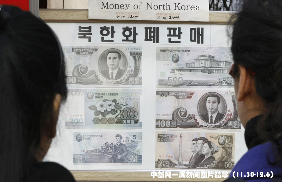 12月1日,韩国板门店一侧的韩国游客正在一块展板前看新出的朝鲜货币。据朝鲜官员当日对外透露,朝鲜于11月30日更换了货币,这是该国十七年来首次更换货币。新旧货币兑换率为100比1。图片来源:中国新闻网